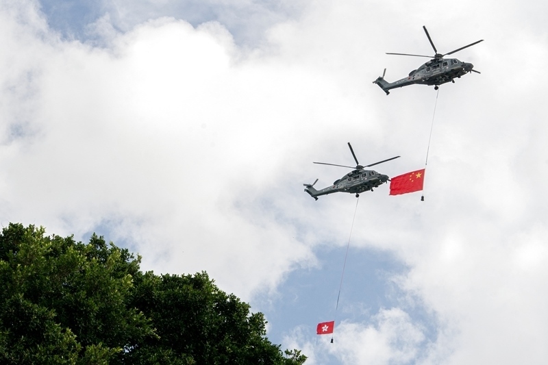 7月1日,香港特區(qū)政府在金紫荊廣場(chǎng)舉行升旗儀式,慶祝香港回歸祖國(guó)28周年。這是分別懸掛中華人民共和國(guó)國(guó)旗、香港特區(qū)區(qū)旗的直升機(jī)從空中飛過(guò)。