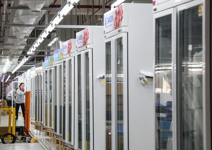 這是在西科冷鏈廣東江門制造基地的產線上,工人對一批出口海外的商用冷柜進行外觀檢查(2025年3月22日攝)。新華社記者 劉大偉 攝