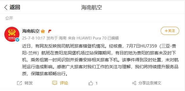 據(jù)海南航空官方微博消息,近日,有網(wǎng)友反映海南航空航班旅客錯(cuò)登機(jī)情況。經(jīng)核查,7月7日HU7359(三亞-貴陽-蘭州)航班在貴陽龍洞堡機(jī)場(chǎng)過站保障期間,有目的地為貴陽的旅客未及時(shí)下機(jī),乘務(wù)組第一時(shí)間識(shí)別并妥善安排相關(guān)旅客下機(jī)。該事件得到及時(shí)處置,未對(duì)航班運(yùn)行造成影響。