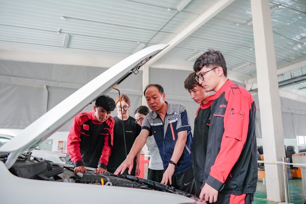2025年6月27日,在新疆和田技師學(xué)院,北京援疆教師李寶(右三)和當(dāng)?shù)亟處熞煌笇?dǎo)學(xué)生維修汽車(chē)。新華社記者 徐宏巖 攝