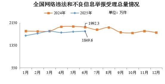 中新網(wǎng)7月9日電 據(jù)“中央網(wǎng)信辦舉報(bào)中心”微信公眾號消息,2025年6月,中央網(wǎng)信辦舉報(bào)中心指導(dǎo)全國各級網(wǎng)信舉報(bào)工作部門、主要網(wǎng)站平臺受理網(wǎng)民舉報(bào)色情、賭博、侵權(quán)、謠言等違法和不良信息1849.6萬件,環(huán)比增長1.1%、同比下降7.2%。其中,中央網(wǎng)信辦舉報(bào)中心受理舉報(bào)39.8萬件,環(huán)比下降9.5%、同比下降15.1%;各地網(wǎng)信舉報(bào)工作部門受理舉報(bào)63.7萬件,環(huán)比增長6.6%、同比下降50%;全國主要網(wǎng)站平臺受理舉報(bào)1746.1萬件,環(huán)比增長1.2%、同比下降4%。