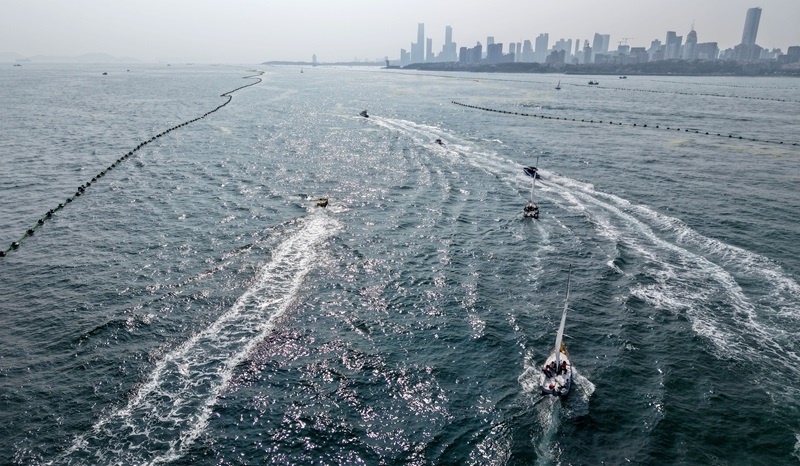 青島小麥島附近海域,市民和游客乘坐帆船參加海上巡游活動(7月10日攝,無人機照片)。