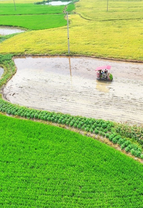 7月13日,湖南省衡陽市衡東縣霞流鎮(zhèn)農民駕駛農機進行晚稻插秧工作(無人機照片)。