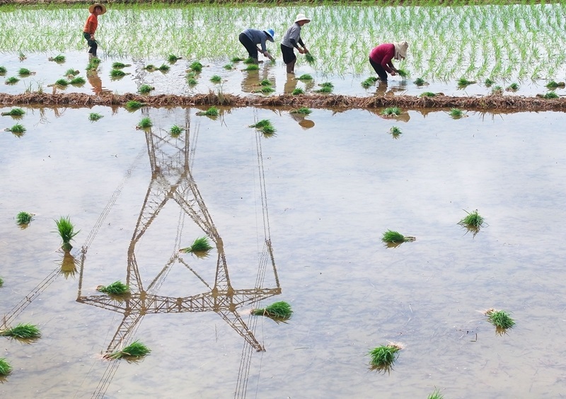 7月13日,湖南省衡陽市衡東縣霞流鎮(zhèn)農民在搶插晚稻(無人機照片)。