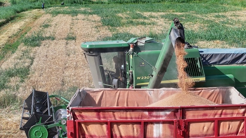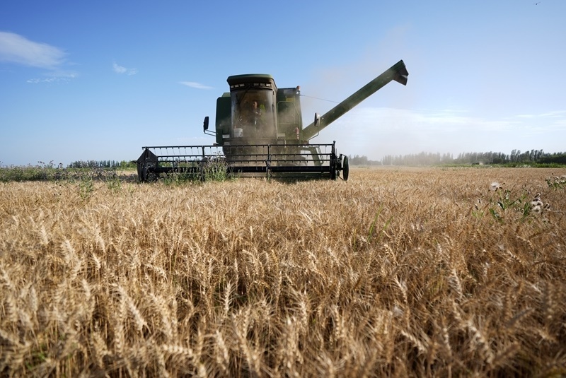 近日,寧夏銀川市引黃灌區(qū)迎來小麥收獲季,當?shù)剞r(nóng)戶搶抓晴好有利天氣,開展夏收工作。