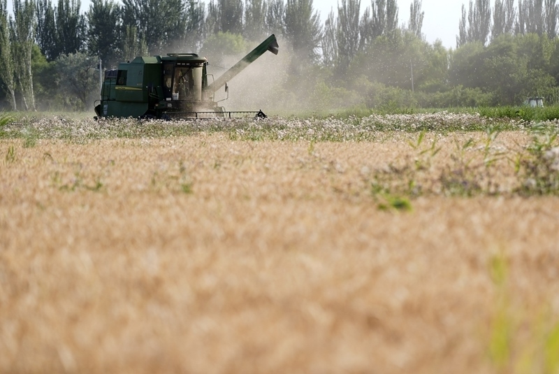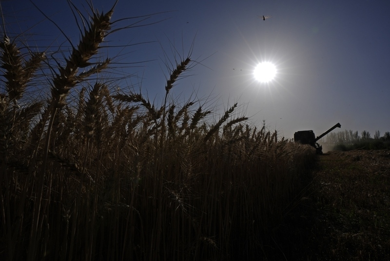 7月15日,收割機在銀川市賀蘭縣立崗鎮(zhèn)蘭星村收獲小麥。