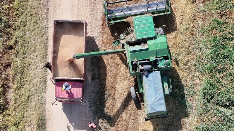 7月15日,收割機在銀川市賀蘭縣立崗鎮(zhèn)蘭星村收獲小麥(無人機照片)。