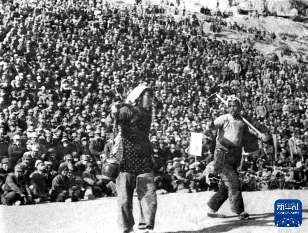 延安魯迅文藝學(xué)院王大化、李波在廣場為群眾演出秧歌劇《兄妹開荒》。吳印咸 攝