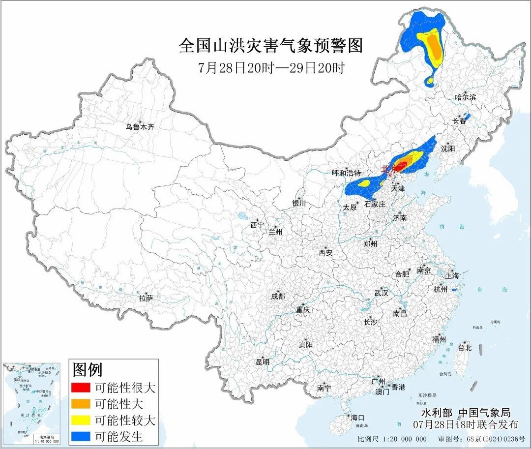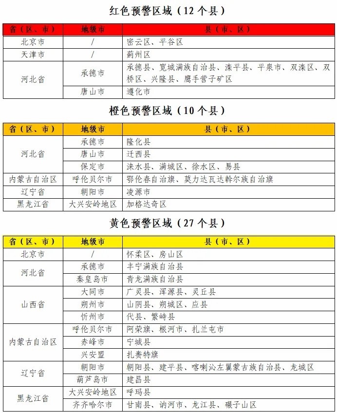 據(jù)“中國水利”微信公眾號消息,水利部和中國氣象局7月28日18時聯(lián)合發(fā)布紅色山洪災害氣象預警:預計,7月28日20時至7月29日20時,北京東部、天津北部、河北中部和東北部、內蒙古東北部、遼寧西部、黑龍江西部等地部分地區(qū)發(fā)生山洪災害可能性大(橙色預警),其中,北京東部、天津北部、河北東北部局地發(fā)生山洪災害可能性很大(紅色預警),預警區(qū)域涉及的縣(市、區(qū))見下表。其他地區(qū)也可能因局地短歷時強降水引發(fā)山洪災害,請各地注意做好實時監(jiān)測、防汛預警和轉移避險等防范工作。