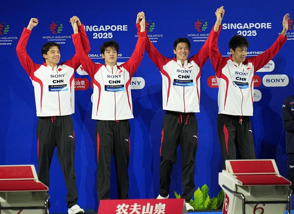 8月1日,由季新杰、潘展樂、汪順、張展碩(從左至右)組成的中國隊(duì)在頒獎(jiǎng)儀式上。新華社記者 夏一方 攝