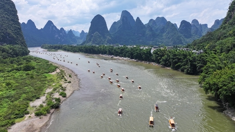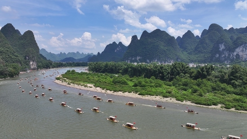 8月10日,在漓江廣西桂林市陽朔縣興坪鎮(zhèn)段,游客乘竹筏游玩賞景(無人機(jī)照片)。