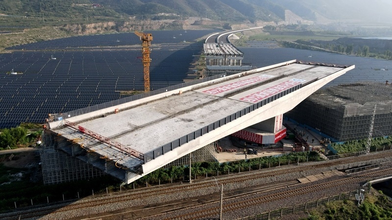 這是8月11日拍攝的河南省濟源市沿太行山高速公路跨焦柳鐵路立交橋轉體施工現(xiàn)場。