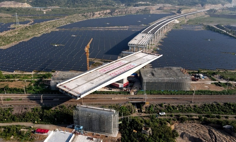 這是8月11日拍攝的河南省濟源市沿太行山高速公路跨焦柳鐵路立交橋轉體施工現(xiàn)場(無人機照片)。