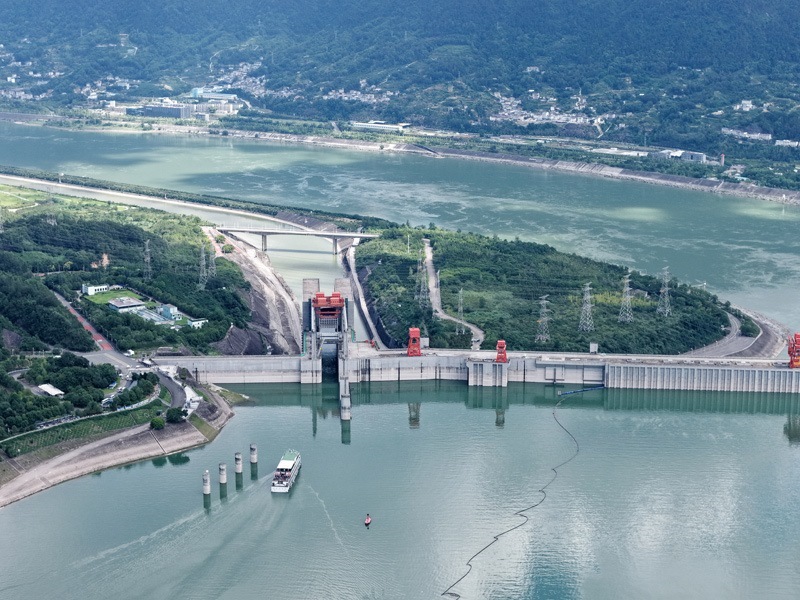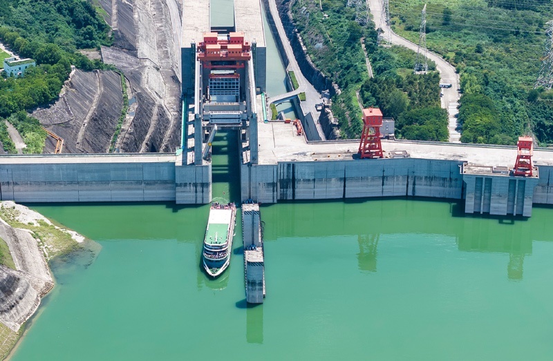 8月16日,在湖北省宜昌市,下行游船長(zhǎng)江三峽5號(hào)通過(guò)三峽升船機(jī)(無(wú)人機(jī)照片)。