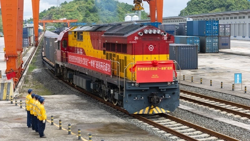 8月19日,貴州首趟多式聯(lián)運(yùn)“一單制”班列從貴陽(yáng)國(guó)際陸港都拉營(yíng)站出發(fā)(無(wú)人機(jī)照片)。