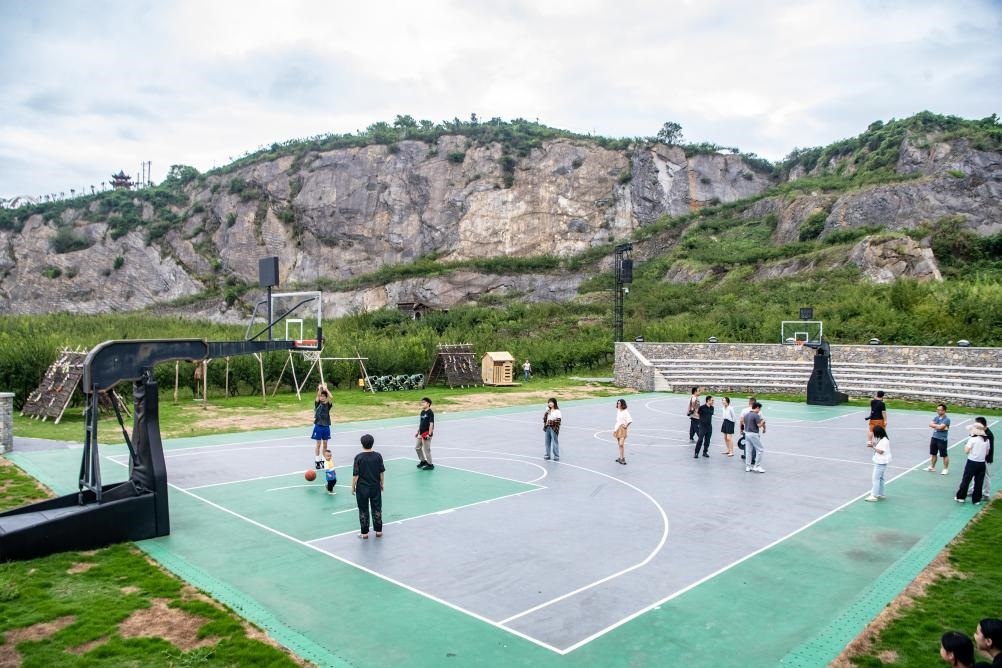8月16日,在重慶市北碚區(qū)靜觀鎮(zhèn)中華村,游客在礦坑修復(fù)改造的運動場內(nèi)打球。新華社記者 唐奕 攝