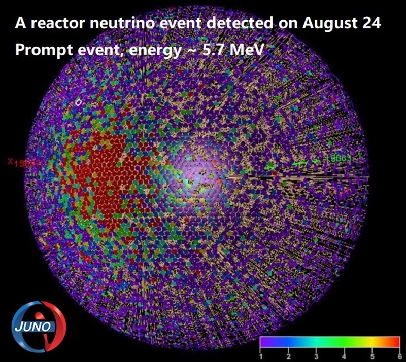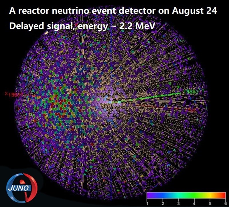 這是8月24日江門中微子實驗探測到的一個反應(yīng)堆中微子事例示意圖。