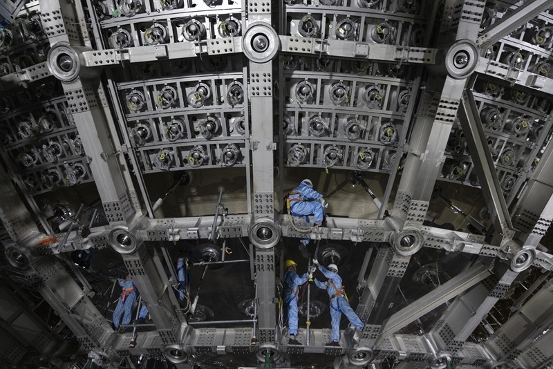 工人在江門中微子實驗中心探測器不銹鋼網(wǎng)架上施工(2024年10月10日攝)。