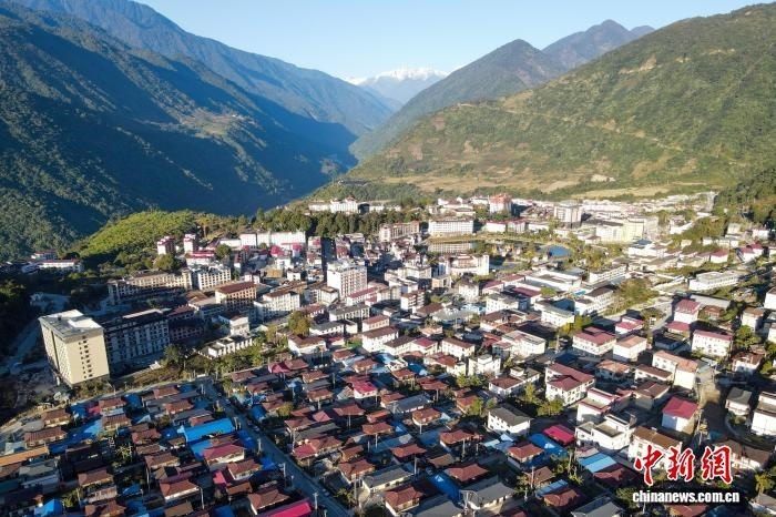 圖為2023年12月19日,航拍西藏扎墨公路通車(chē)10年后的墨脫縣城。江飛波 攝