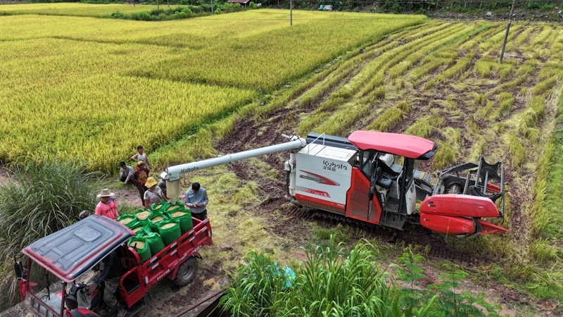 8月30日,云南省勐臘縣勐侖鎮(zhèn)大卡村農(nóng)民運送剛收獲的水稻(無人機(jī)照片)。