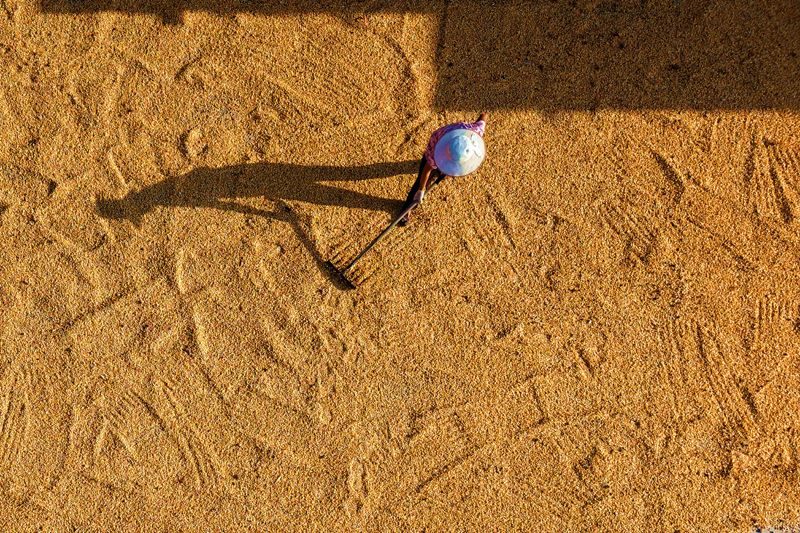 9月2日,山東省臨沂市平邑縣臨澗鎮(zhèn)農(nóng)民在晾曬收獲的玉米(無人機(jī)照片)。