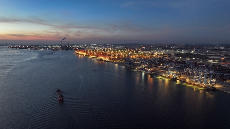9月4日,海輪??繗J州港集裝箱自動化碼頭裝卸集裝箱(無人機照片)。