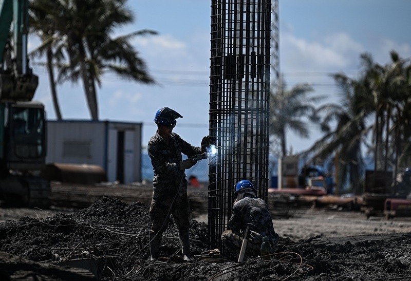 9月5日,工人在海南商業(yè)航天發(fā)射場二期項(xiàng)目四號發(fā)射工位施工。
