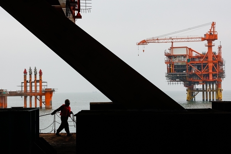 9月8日,工人在墾利6-1油田10-1北區(qū)塊Ⅱ期開發(fā)項目油氣平臺安裝作業(yè)現(xiàn)場施工。