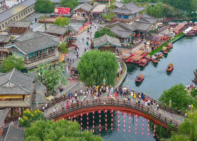 10月5日,游客在湖北省襄陽市唐城景區(qū)游玩(無人機照片)。
