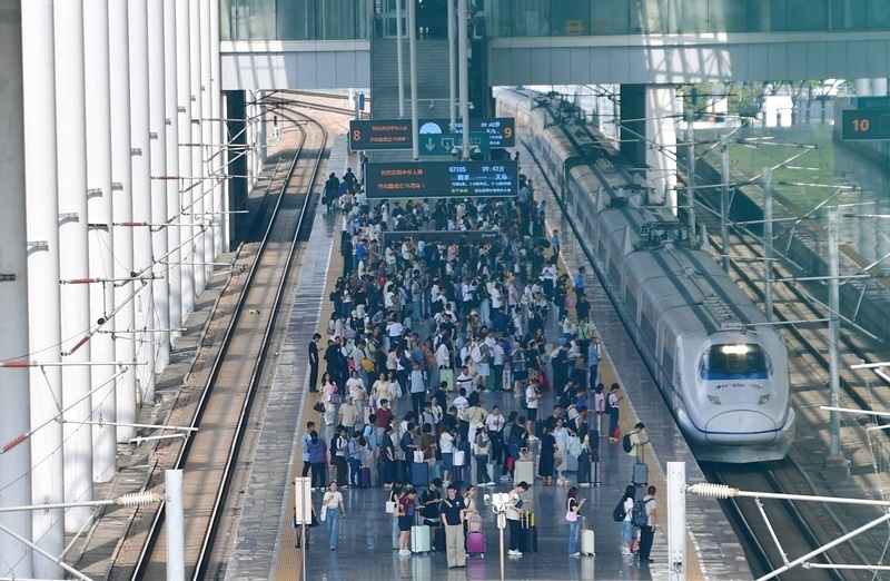 10月8日,旅客在江蘇無錫火車站站臺(tái)乘車。