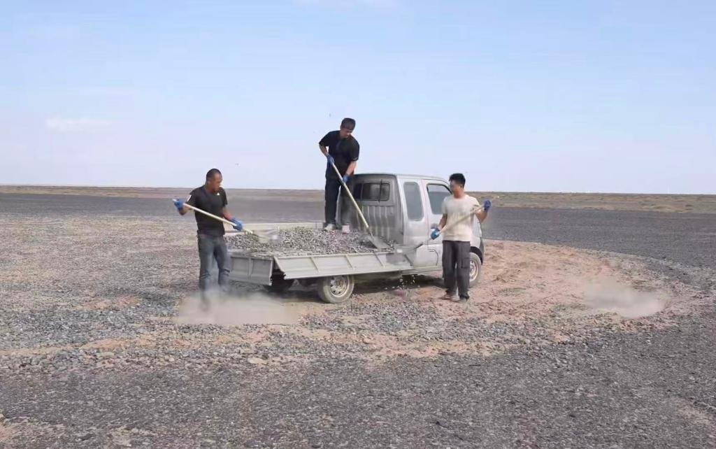 “看到車輪碾過標(biāo)語(yǔ)那一刻,就像碾在歷史的脊梁上?!本W(wǎng)絡(luò)博主陸遙得知標(biāo)語(yǔ)被破壞后,主動(dòng)驅(qū)車兩千多公里,經(jīng)歷六天抵達(dá)哈密。他和朋友們拉運(yùn)20噸砂石,才終于修復(fù)這些“疤痕”。