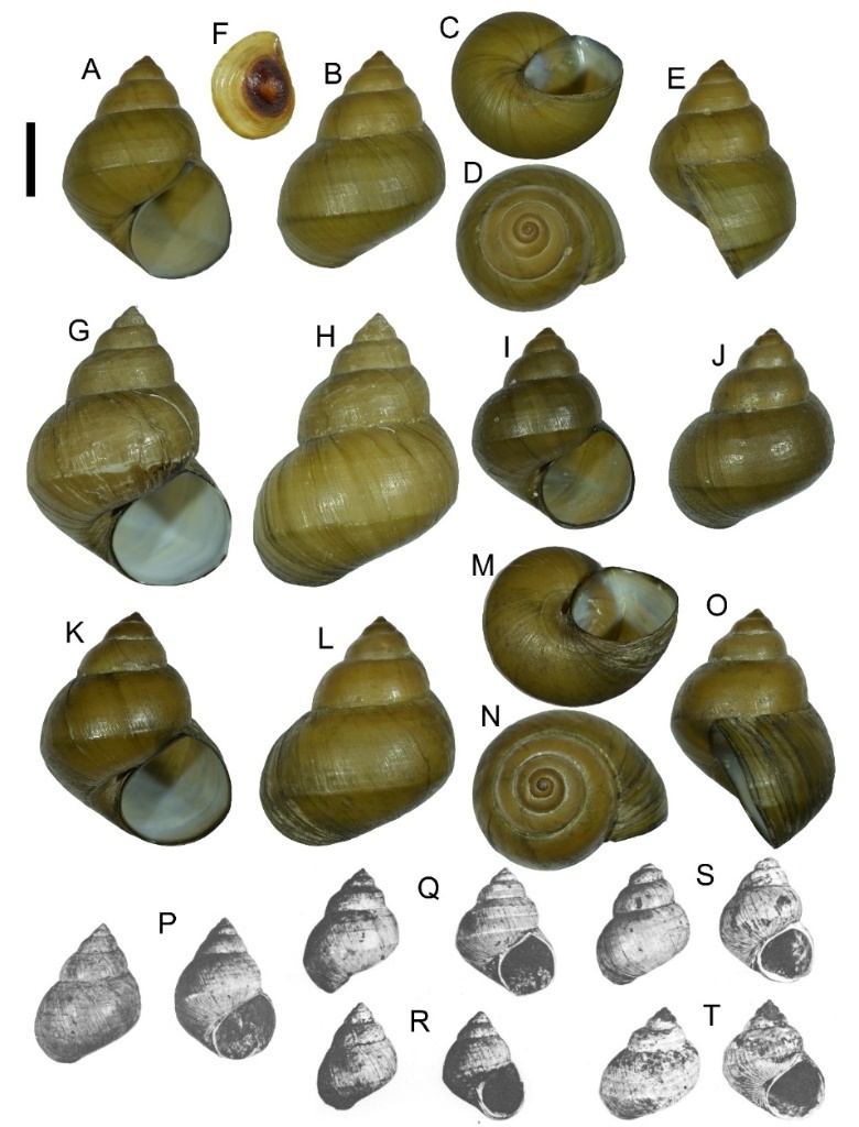 李四光婭田螺的現(xiàn)生個體貝殼(A—O)以及發(fā)現(xiàn)于第四紀沉積層的貝殼模式標本(P—T)。(中國科學(xué)院昆明動物研究所東南亞野生動物多樣性課題組供圖)