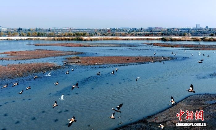 中新網(wǎng)烏魯木齊10月28日電 (黨艷麗)深秋時節(jié),成群結(jié)隊的灰雁“到訪”新疆可克達(dá)拉市。它們或飛翔在湛藍(lán)的天空上,發(fā)出陣陣鳴叫聲;或集結(jié)在伊犁河可克達(dá)拉市段河畔,補給“能量”,為接下來的遷徙旅程做足準(zhǔn)備。