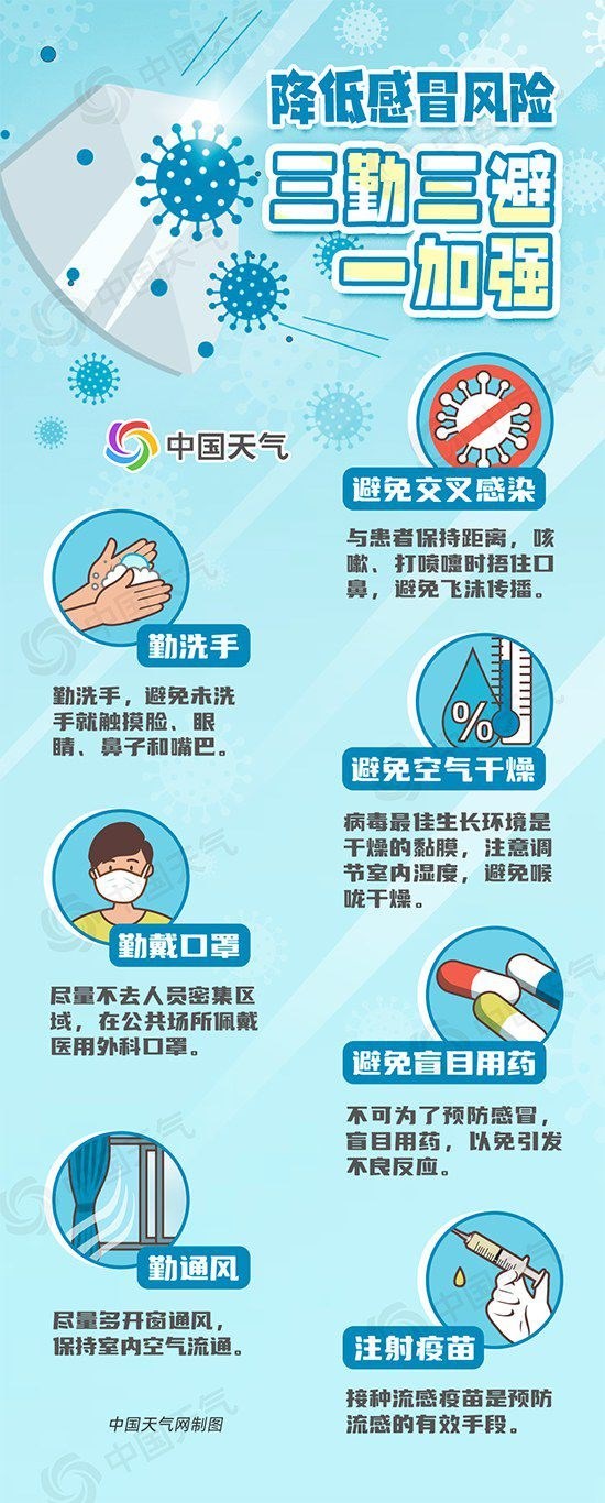 時值霜降時節(jié),正是秋冬季溫差最大的時期。加上近期冷空氣活動頻繁,氣溫起伏明顯,流感病毒傳播趨于活躍,感冒風險顯著上升。如何科學預防感冒?中國天氣網(wǎng)總結(jié)了“三勤三避一加強”防御口訣,幫你筑牢健康防線。
