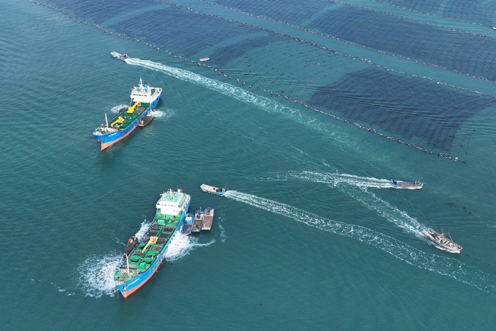 ↑ 11月11日,在山東省榮成市愛(ài)倫灣海洋牧場(chǎng),運(yùn)鮮船在裝運(yùn)鮑魚(yú)南下福建越冬(無(wú)人機(jī)照片)。新華社發(fā)(王福東 攝)