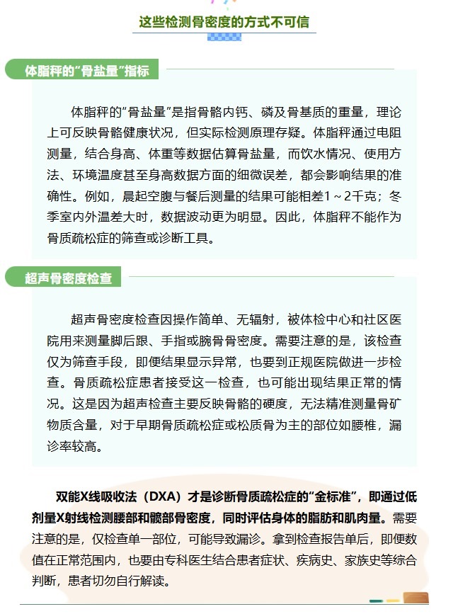 骨骼健康是人體健康的重要組成部分,其評(píng)估指標(biāo)不僅包括鈣含量,還涉及骨骼強(qiáng)度等多方面的因素,而骨密度在一定程度上,可以反映骨骼健康狀態(tài)。需要明確的是,并非人人都需要進(jìn)行骨密度檢查。而且,當(dāng)下流行的體脂秤及體檢中常用的超聲骨密度檢查,均不能作為診斷骨質(zhì)疏松癥的依據(jù)。正確認(rèn)識(shí)骨密度檢查的適用人群,既能避免醫(yī)療資源浪費(fèi),也能減少不必要的健康焦慮。