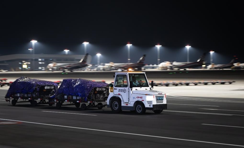 子夜時(shí)分,記者驅(qū)車來到這座機(jī)場時(shí),撲面而來的是一派“不夜空港”的繁忙景象:雪亮的停機(jī)坪上,貨機(jī)剛一停穩(wěn),工作人員便操控牽引車、加油車、轉(zhuǎn)運(yùn)車簇?fù)矶希敦?、加油、檢查,井井有條,一刻也不耽誤。