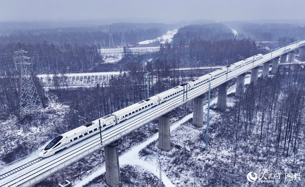 一列和諧號動車組列車行駛在沈白高鐵長白山區(qū)段線路上。