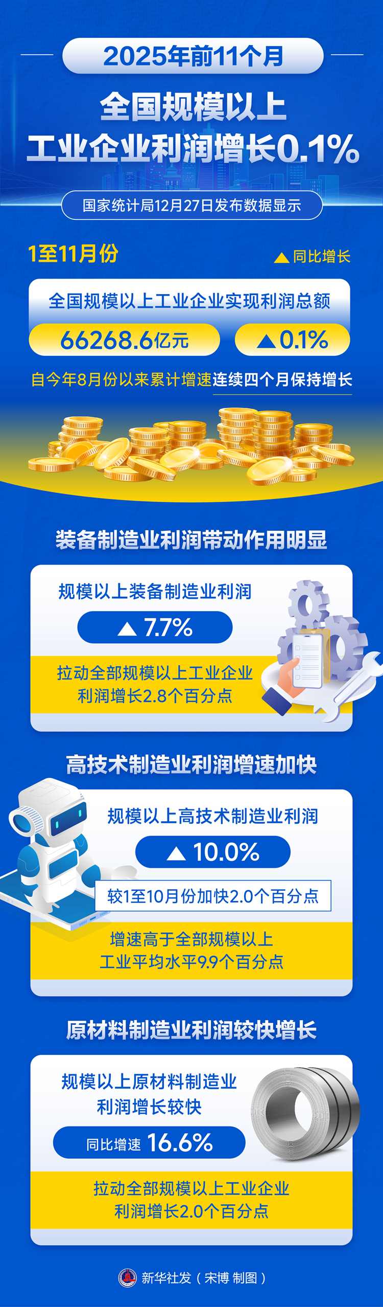 新華社北京12月27日電(記者王雨蕭)國家統(tǒng)計局27日發(fā)布數(shù)據(jù)顯示,1至11月份,全國規(guī)模以上工業(yè)企業(yè)實現(xiàn)利潤總額66268.6億元,同比增長0.1%,自今年8月份以來累計增速連續(xù)四個月保持增長。