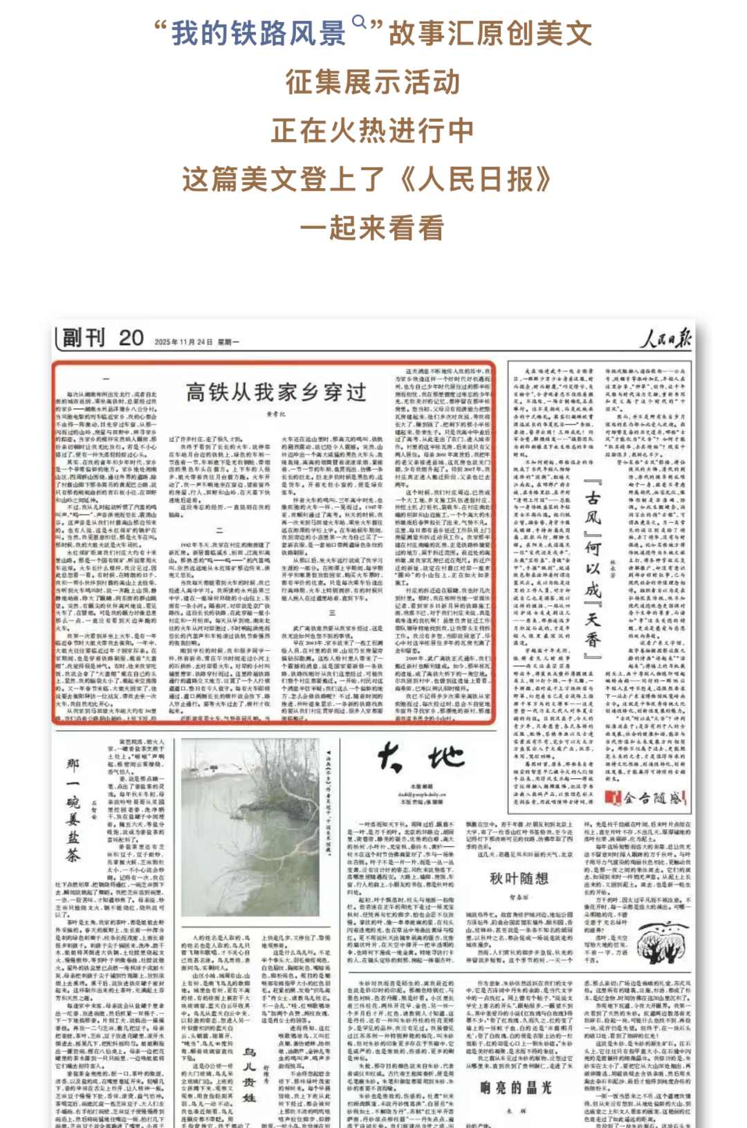 2025年,中宣部文明創(chuàng)建局、中央網(wǎng)信辦網(wǎng)絡(luò)傳播局、廣電總局宣傳司、中國(guó)作協(xié)創(chuàng)聯(lián)部、國(guó)鐵集團(tuán)黨組宣傳部聯(lián)合開(kāi)展三季“我的鐵路風(fēng)景”主題宣傳活動(dòng),人民日?qǐng)?bào)、央視新聞、新華網(wǎng)客戶端、學(xué)習(xí)強(qiáng)國(guó)、中國(guó)文明網(wǎng),抖音、微博、小紅書(shū)和“中國(guó)鐵路”全媒體等20余個(gè)平臺(tái)傾力承辦,共征集到原創(chuàng)作品76萬(wàn)余個(gè),展示傳播7萬(wàn)余個(gè),話題傳播量超90億人次。