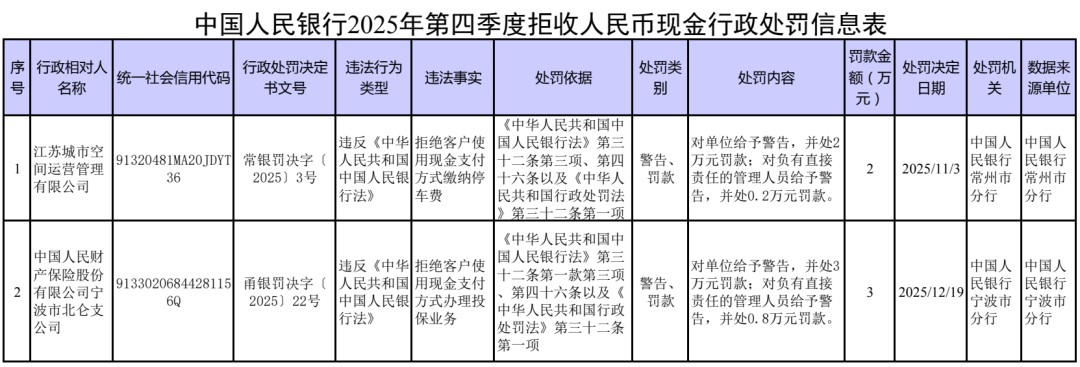 據(jù)中國人民銀行微信公眾號消息,2025年第四季度,中國人民銀行對2家核實為拒收人民幣現(xiàn)金的單位及相關(guān)責(zé)任人依法作出經(jīng)濟(jì)處罰。廣大經(jīng)營主體應(yīng)強化法治觀念,尊重公眾支付選擇權(quán),共同打造和諧現(xiàn)金流通環(huán)境。