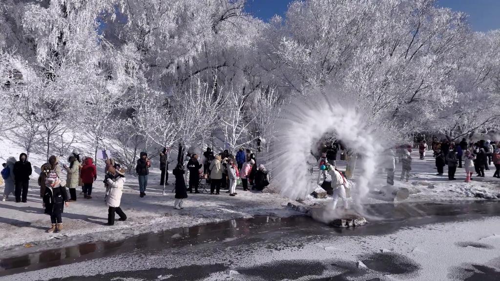 寒冬時(shí)節(jié),吉林省吉林市松花江畔?,F(xiàn)“忽如一夜春風(fēng)來(lái),千樹(shù)萬(wàn)樹(shù)梨花開(kāi)”的霧凇奇景。