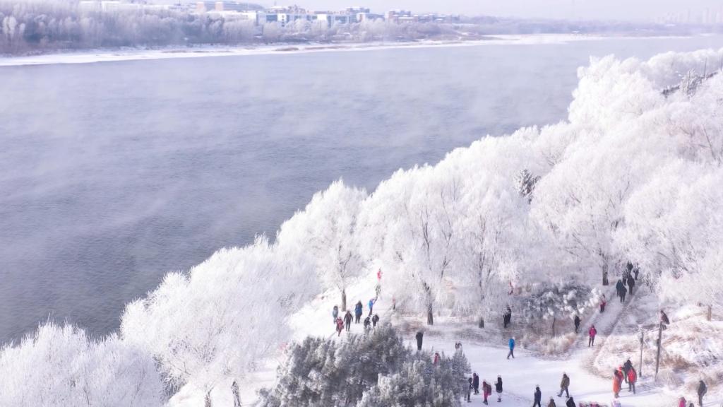 晨光中,江畔柳樹(shù)、松枝綴滿冰晶,如玉樹(shù)瓊枝,游人穿梭其間,仿佛置身冰雪仙境。