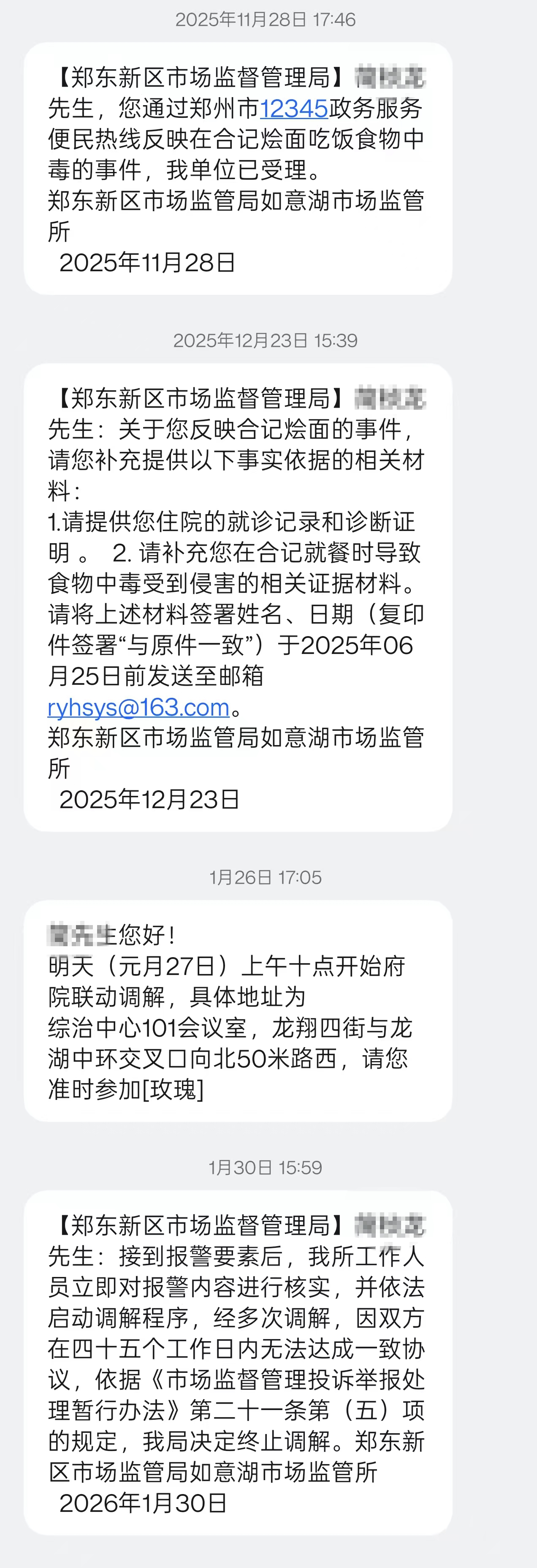 此后,鄭東新區(qū)市場監(jiān)督管理局向簡先生表示:經(jīng)多次調(diào)解,因雙方在四十五個工作日內(nèi)無法達成一致協(xié)議,依據(jù)《市場監(jiān)督管理投訴舉報處理暫行辦法》第二十一條第(五)項的規(guī)定,我局決定終止調(diào)解。