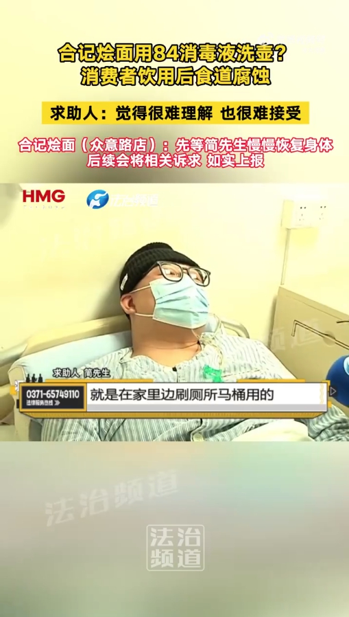 彼時,鄭州合記燴面眾意路店負責人接受媒體采訪時表示,店里平時不允許這樣做,服務員為了圖省事,私自將原本用作打掃衛(wèi)生的84消毒液,滴了一滴清洗水壺,另一名服務員在不知情的情況下拎上了餐桌。