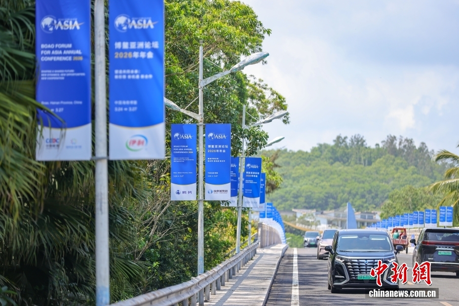 3月17日,博鰲亞洲論壇2026年年會(huì)各項(xiàng)籌備工作正有序推進(jìn),海南博鰲街頭的盛會(huì)氛圍日漸濃厚。以“塑造共同未來(lái):新形勢(shì)、新機(jī)遇、新合作”為主題的博鰲亞洲論壇2026年年會(huì)將于3月24日至27日在海南博鰲召開(kāi)。圖為博鰲培蘭橋道路兩側(cè),博鰲亞洲論壇2026年年會(huì)道旗整齊排列。中新社記者 駱云飛 攝