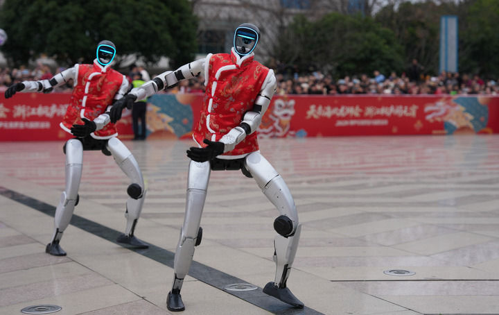 2026年2月28日,宇樹科技人形機器人在浙江省桐廬縣中心廣場表演舞蹈。新華社記者黃宗治 攝