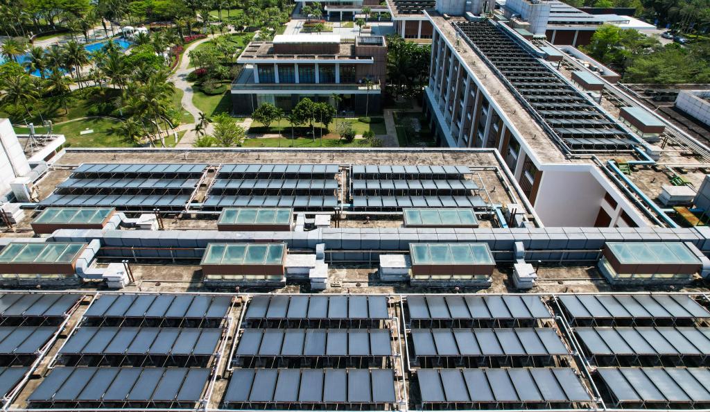 在博鰲零碳示范區(qū)拍攝的博鰲亞洲論壇國(guó)際會(huì)議中心和博鰲亞洲論壇大酒店屋頂?shù)墓夥O(shè)備(3月19日攝,無人機(jī)照片)。