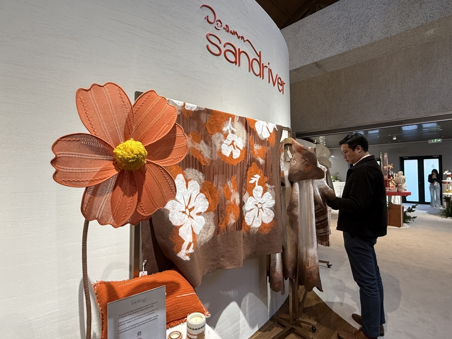 “踏花影”區(qū)域是一個五感體驗的沉浸空間。藝術(shù)羊絨品牌Sandriver沙涓現(xiàn)場還原了日喀則羊絨氆氌工坊、果洛牦牛絨氆氌工坊的織機操作,匠人以雙手穿梭,在經(jīng)緯交錯間演繹“高原的溫度”,消費者能近距離觀看從捻紗到成胚的全過程,感受這一非物質(zhì)文化遺產(chǎn)的匠心精神。沙涓品牌負(fù)責(zé)人介紹,品牌將首發(fā)羊絨睡袍系列新品、馬年主題哈尼繡系列以及羊絨艾德萊斯家居毯等作品,展現(xiàn)傳統(tǒng)工藝與當(dāng)代生活美學(xué)融合的羊絨設(shè)計。