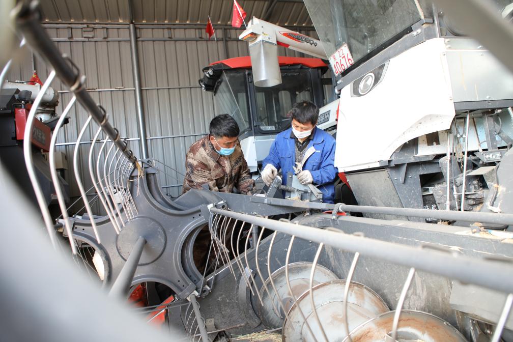 在科爾沁右翼前旗,工作人員正在檢修農(nóng)機。(時秀霞 攝)